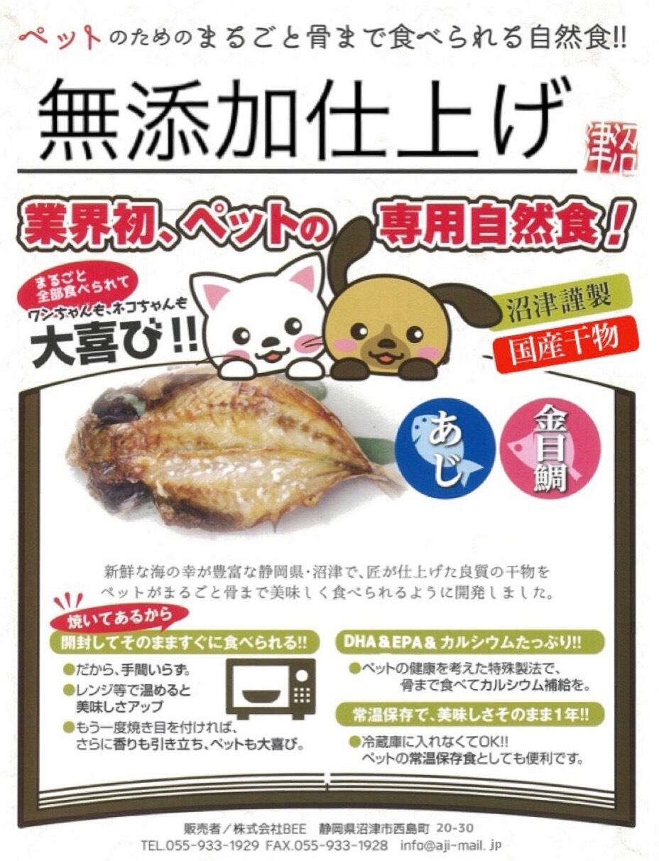新鮮な海の幸が豊富な静岡県・沼津で、匠が仕上げた良質の『真鯵』をペットがまるごと骨まで美味しく食べられるように開発しました。